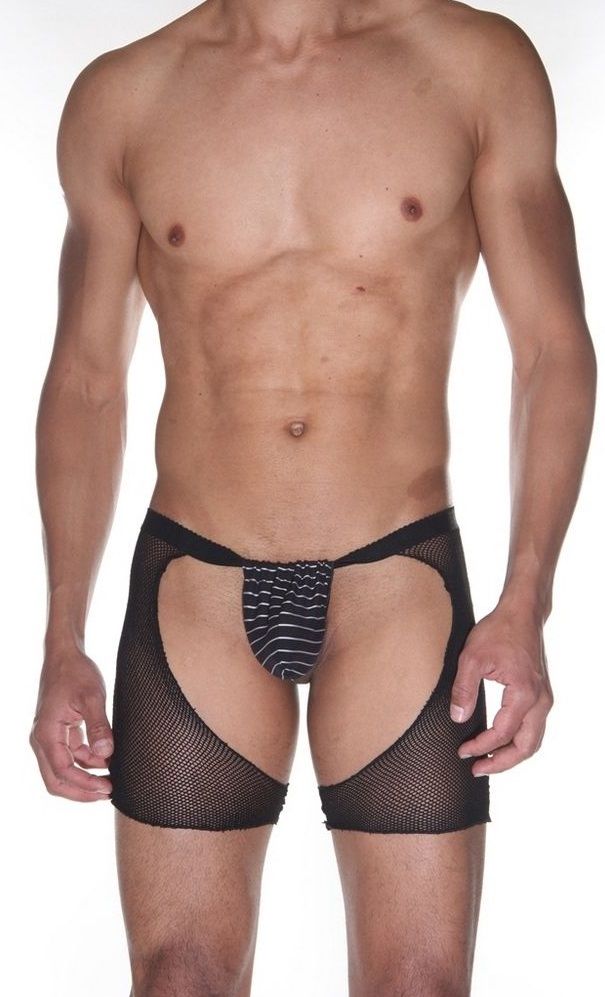 Черного цвета джоки, оригинального пошива. Трусы сшиты из двух видов материалов - мелкой сетки и черного тянущегося гладкого материала на гульфике в мелкую поперечную полоску. Ягодицы полностью открыты. Пояс неширокий, хорошо тянущийся.