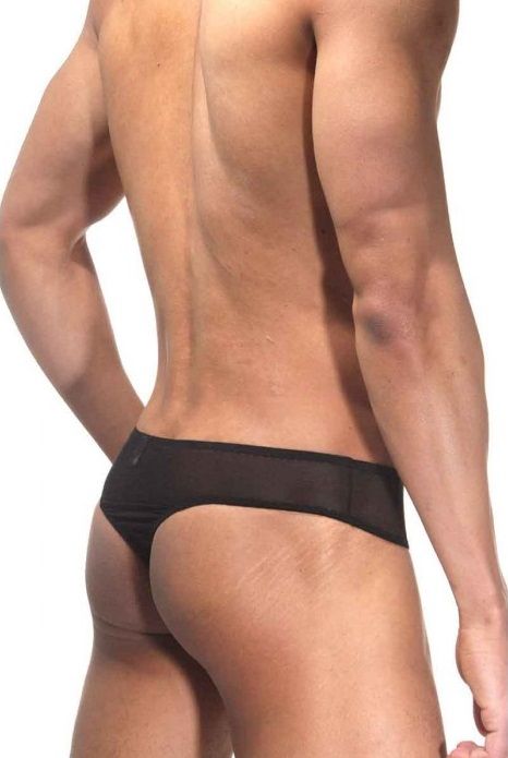 Тонги для мужчин с низкой посадкой, из эластичной полупрозрачной черной ткани.