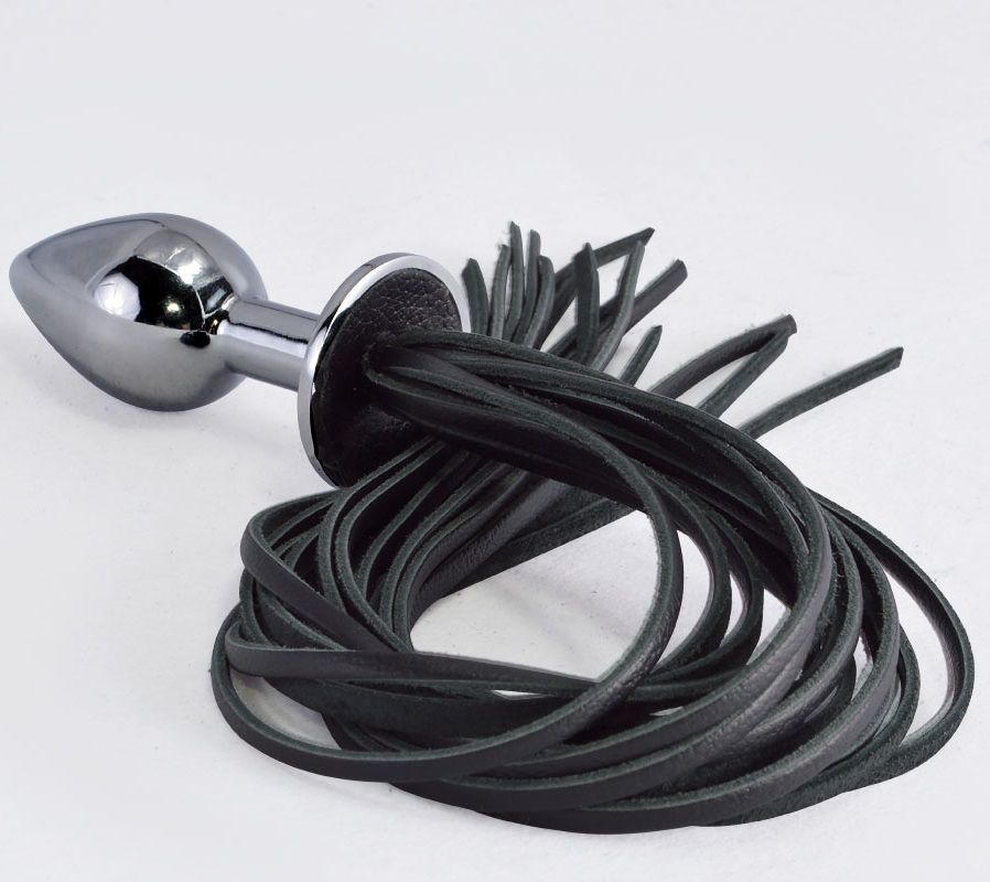 Металлическая анальная пробка каплеобразной формы имеет никелированное покрытие. Хвостовая часть состоит из 16 гладких лент. Они изготовлены из натуральной высококачественной кожи. Длина лент - 30 см., ширина - 0,3 см. Рабочая длина пробки - 3,6 см., диаметр - 2,5 см.