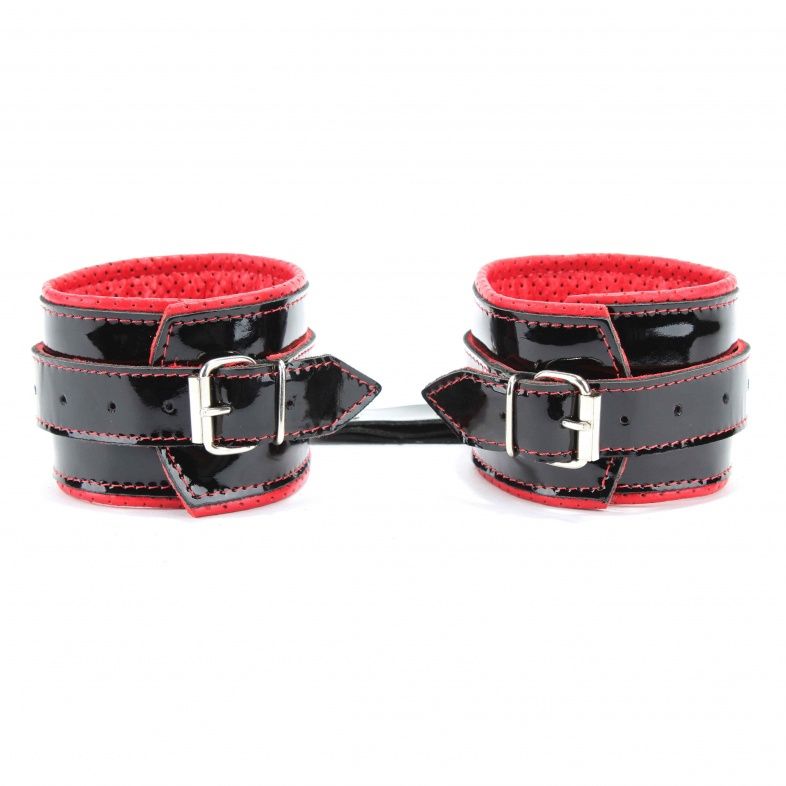 Наручники из натуральной кожи лак черные с интересным узором, подклад мягкая перфорированная кожа. Сварная металлическая фурнитура и цельный хлястик для надежной фиксации. Не нарушают кровообращение, надёжно фиксируются на запястьях с помощью ремешков. Размер универсальный, регулируемый. Ширина - 6 см.