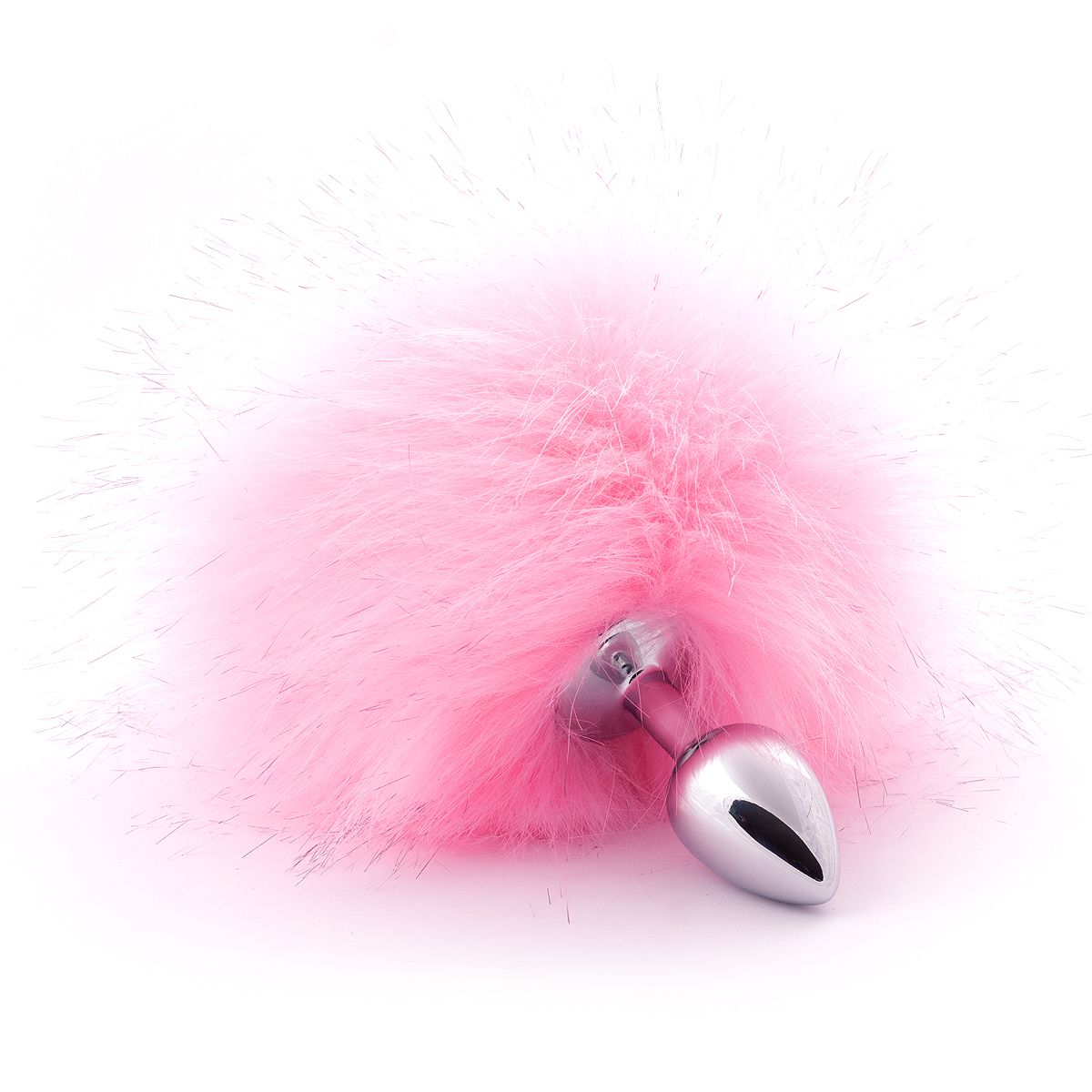 Серебристая анальная пробка с розовым хвостиком. Искусственный эко-мех. Диаметр хвоста — 15 см.